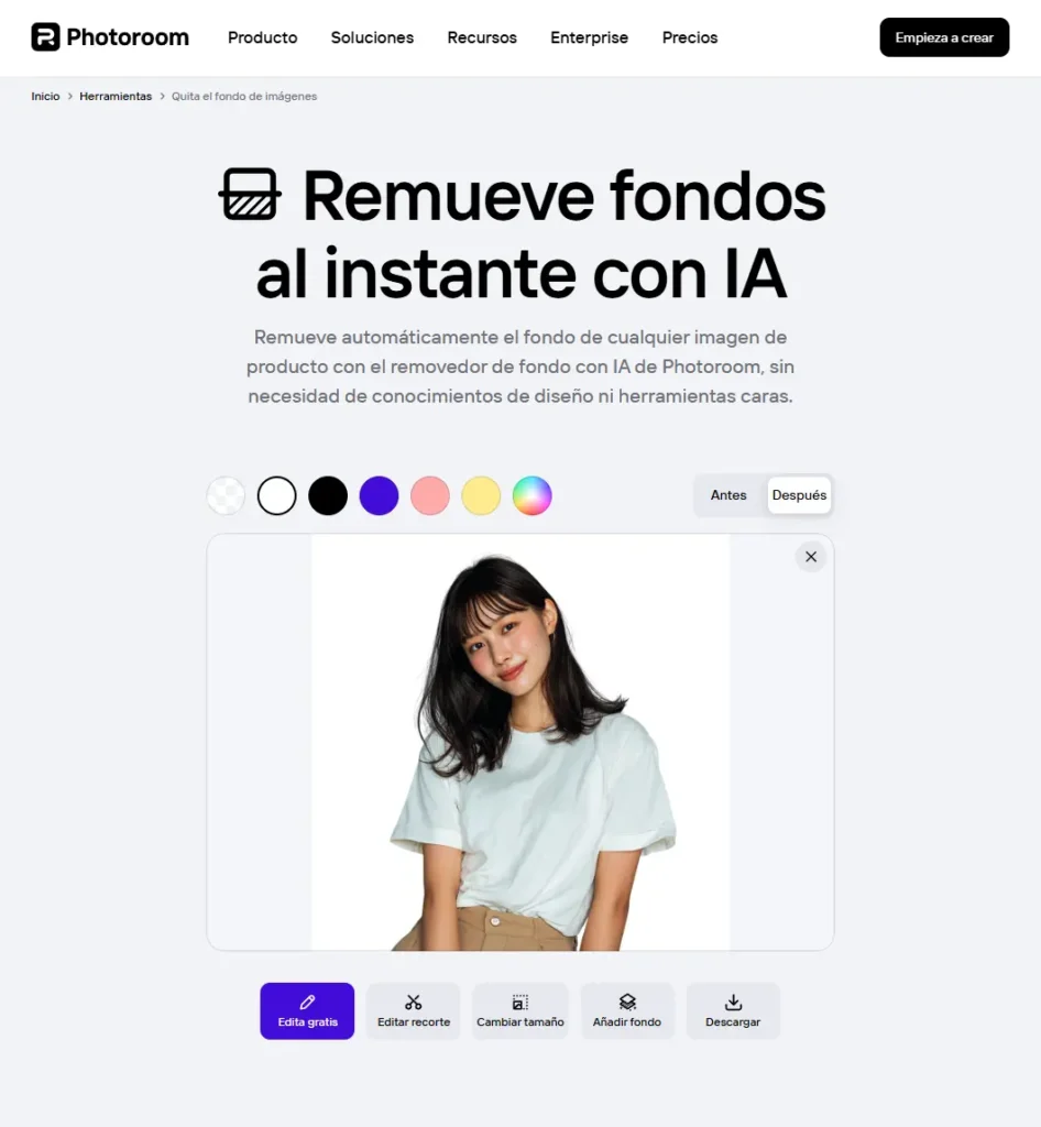 Si necesitás eliminar el fondo de fotos de productos, PhotoRoom es probablemente la mejor herramienta disponible en 2026. Está diseñada específicamente para e-commerce y tiene funciones que van más allá del simple recorte.